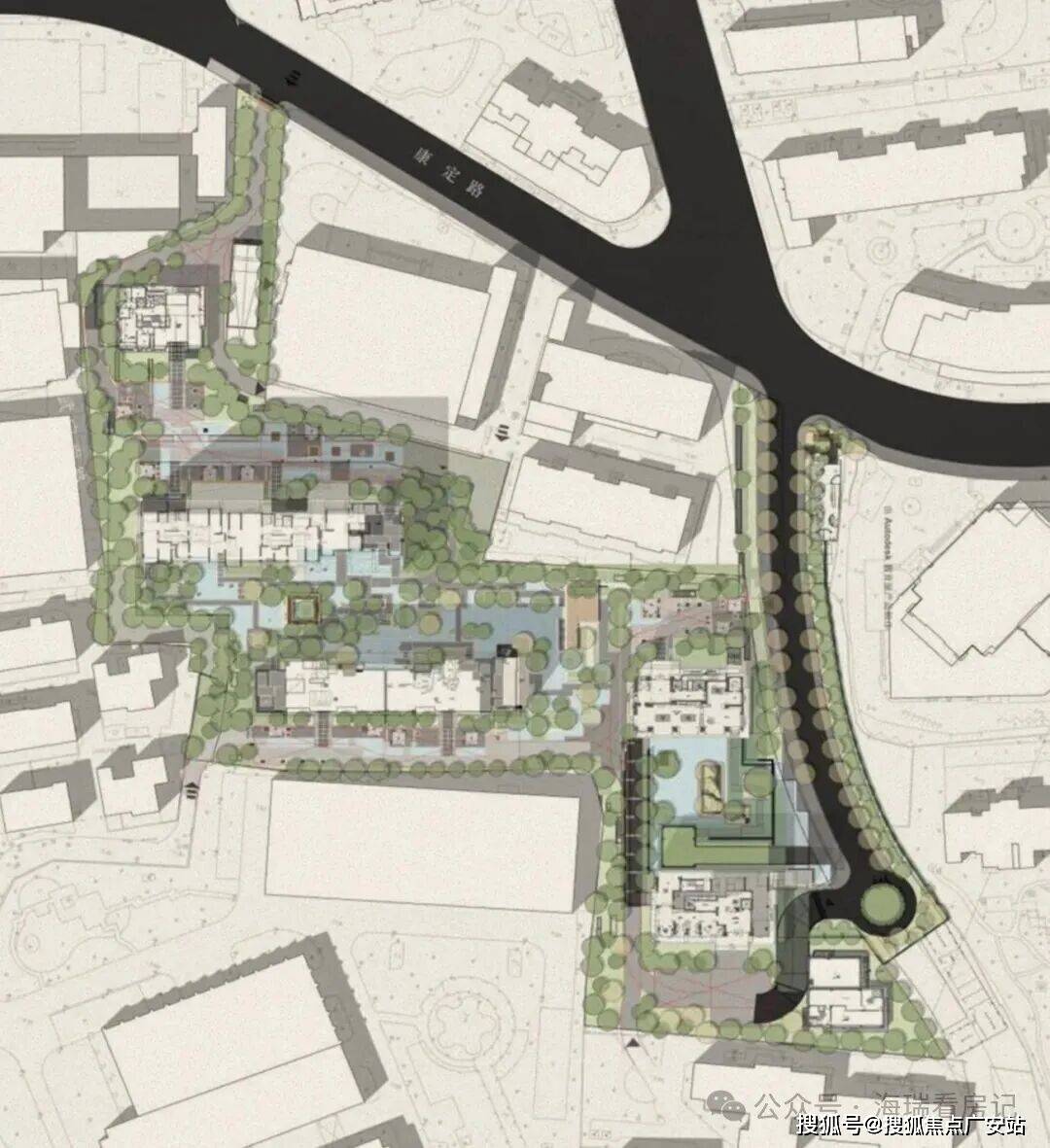 在地块内部本来有条公共通道,康定壹拾玖巧妙地将北侧两栋楼覆土抬高,将公共通道从覆土区穿越,和住区彻底区隔开来,不仅保持了住宅社区的完整性和私密性,还形成了独特的立体台地花园。