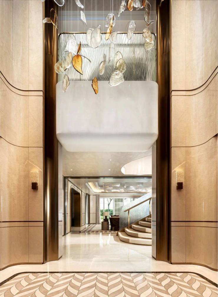 踏入玄关,游艇的奢贵和自然的生动相互映衬,海浪般的弧形线条与意大利艺术玻璃墙面形成潮汐般的视觉冲击。光影在水晶吊灯里流转,客厅与餐厅的朗阔经由珍贵玉石、木料和经典软装点缀,雅致氛围油然而生。主卧空间,融合游艇风的惬意与尊贵,手工艺术树脂板的独特质感与奢华水晶灯饰相得益彰,匠人们的潜心打磨,融入生活的美学定制,让每一寸空间都被赋予了超越平凡的艺术尊严。