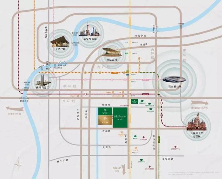 【绿宝园】位居浦东周康板块,接迪士尼国际旅游度假区,北接联洋世纪公园,距离陆家嘴约12公里。并且凭借区域内的中环线 号线等道路交通设施,将康桥和前滩、张江科学城、迪土尼、浦东国际空港、外高桥自由贸易区等五大引擎连成一条黄金轴线。