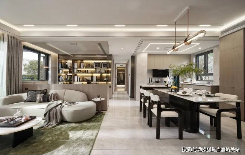厨房、餐厅、客厅三大空间联通,不仅通透感十足,还构建了一个利用率超高的家庭核心区,在这样高度开放的空间里,即使互不交流,也能保持交流和关注!
